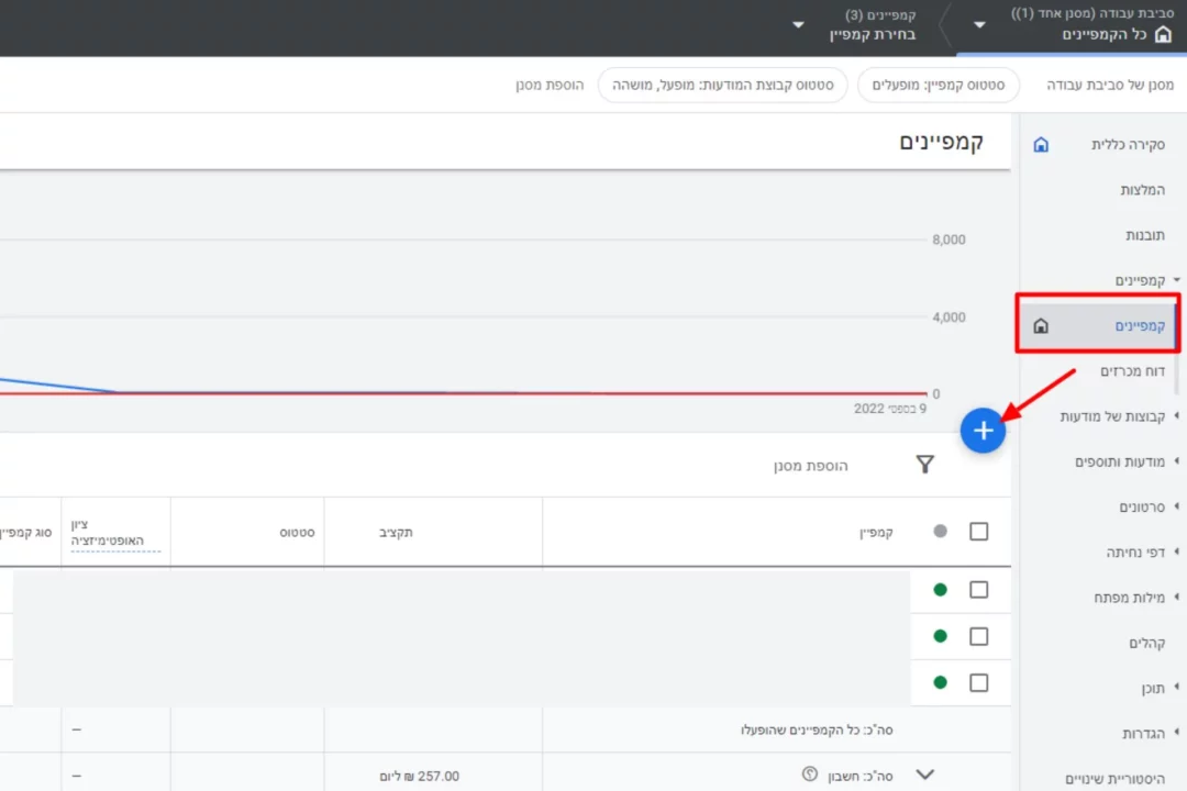 כמו בהקמה של כל קמפיין במערכת גוגל פרסום, יש להיכנס ללשונית של קמפיינים וללחוץ על "+" (הוספת קמפיין חדש):